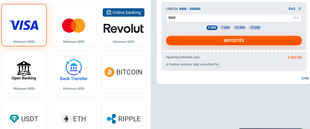 Fizetési módokBankkártya, e-pénztárca, kriptovaluta, helyi megoldások.Gyors tranzakciók, több valutában.Magyar forint támogatott, minimális díjakkal.